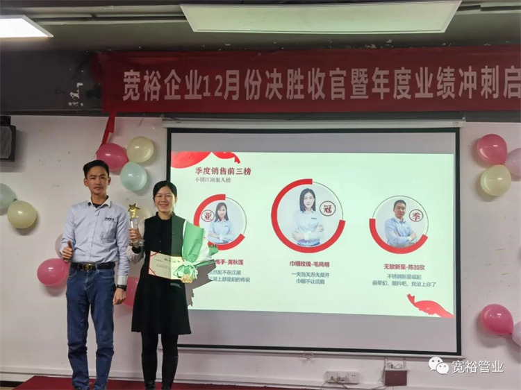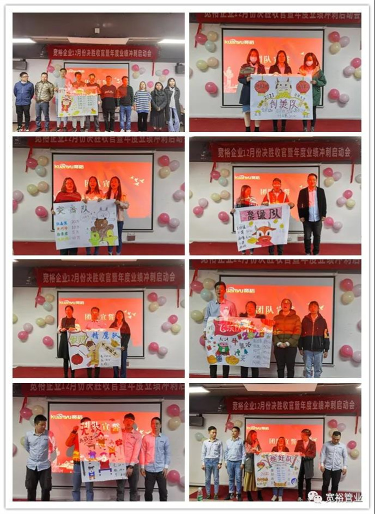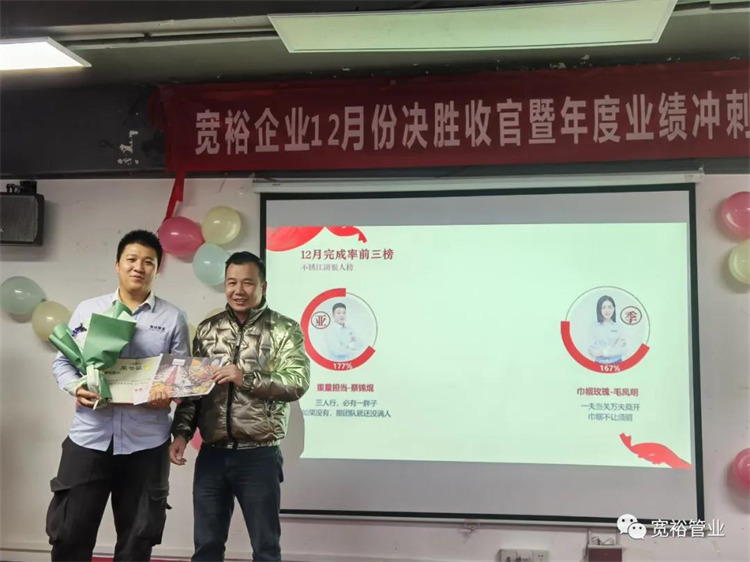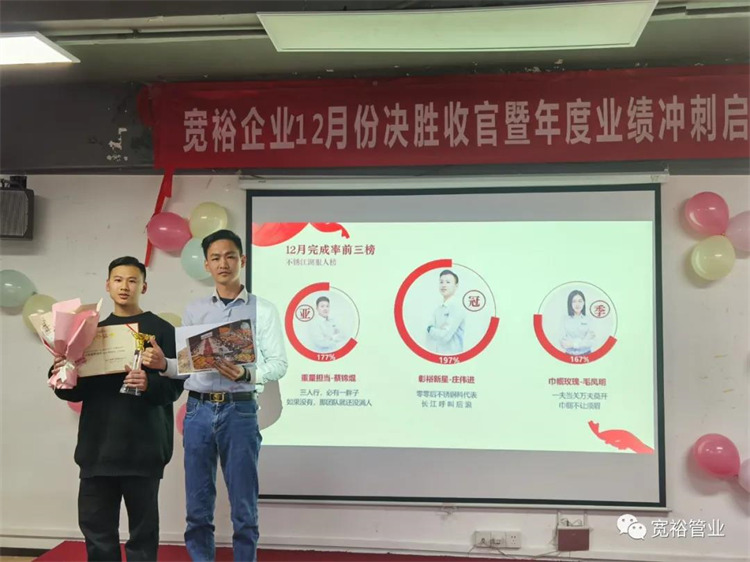 1月6日晚上,寬裕企業(yè)“快樂(lè)掙口糧,幸福過(guò)肥年”之12月收官之戰(zhàn)總結(jié)及頒獎(jiǎng)典禮在企業(yè)總部三樓會(huì)議室隆重舉行!經(jīng)過(guò)了一個(gè)月的奮戰(zhàn),經(jīng)過(guò)一次啟動(dòng)及二次啟動(dòng)的疊加推進(jìn),每天早開(kāi)會(huì)、晚總結(jié),一個(gè)一個(gè)看似微不足道的動(dòng)作,全都為了指向最終目標(biāo)的勝利實(shí)現(xiàn)!寬裕的全體戰(zhàn)士們最終以100%完成沖刺任務(wù)的彪炳戰(zhàn)績(jī)?yōu)?020年畫(huà)上了圓滿的句號(hào)!在此,小編僅代表寬裕企業(yè)感謝所有英勇奮戰(zhàn)的戰(zhàn)士們!感謝臺(tái)前幕后所有的伙伴們共同推動(dòng)了本次收官之戰(zhàn)的勝利!1月6日,我們勝利會(huì)師啦!