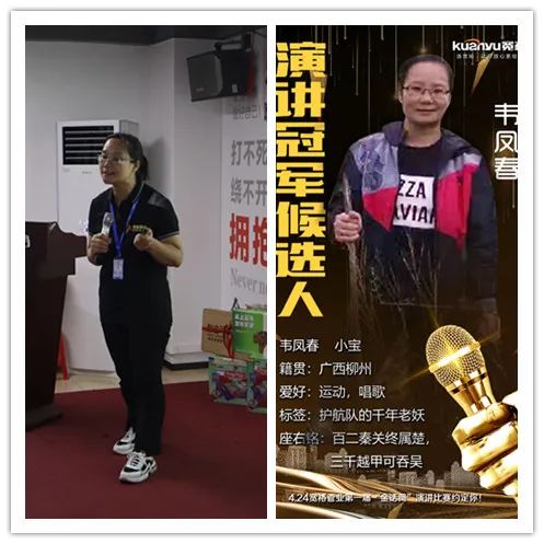 ? 來自護(hù)航隊的韋姐,自稱“千年老妖”,是倉儲部的主管,為人熱心,工作負(fù)責(zé),帶領(lǐng)全體倉儲部同事兢兢業(yè)業(yè)為銷售伙伴提供優(yōu)質(zhì)的后勤保障服務(wù)。忙碌的倉儲工作讓韋姐未能參加前期的培訓(xùn),但她利用晚上的時間自己制作ppt,在比賽前半天閉關(guān)演練?!翱嘈娜耍觳回?fù)!” 韋姐的苦練換來了演講當(dāng)天的出色表現(xiàn)!其流暢自如,氣勢如虹,支持者眾!