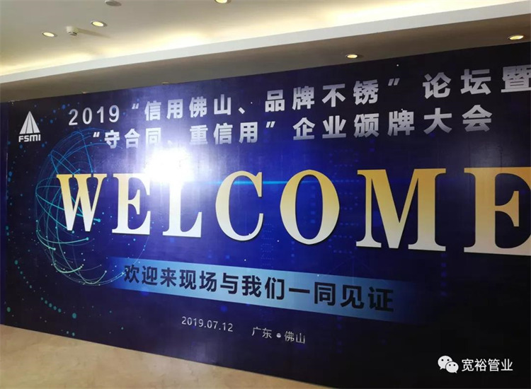 2019年7月12日,雨后天晴,佛山市寬裕不銹鋼有限公司應(yīng)邀參加佛山市金屬材料行業(yè)協(xié)會(huì)主辦的2019“信用佛山、品牌不銹”論壇暨“守合同、重信用”企業(yè)頒牌大會(huì)在禪城希爾頓酒店隆重召開。
